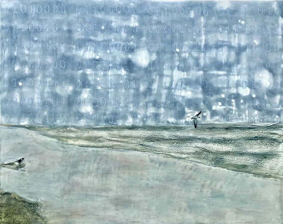 terra: Memory Bits, is a series of paintings found by traversing thousands of frozen moments that have been digitally stockpiled. Moments longing for another breath of life, which comes from taking one more fresh, organic look. These paintings are inspired from my “Memory Bits” taken of nature and then re-imagined through tactile colors, textures, lines, and smells. Each composition hides a hint of the painting’s title in binary code, which becomes a relevant pattern (or motif) of numbers. It represents our visual understanding of how we weave beauty and facts into our daily lives—and gives us a marriage of nature and technology.