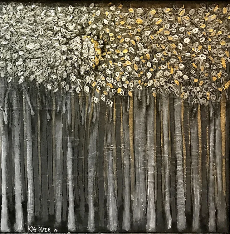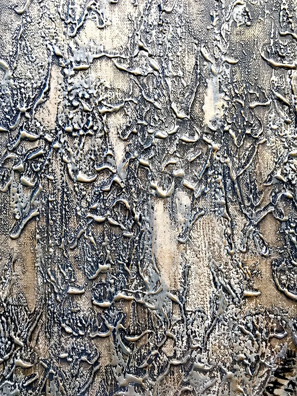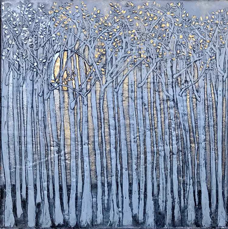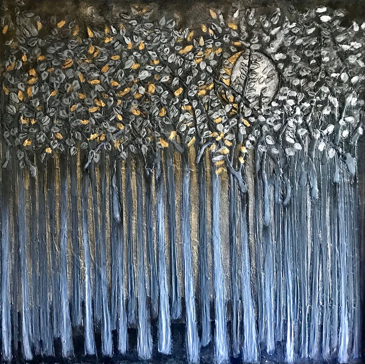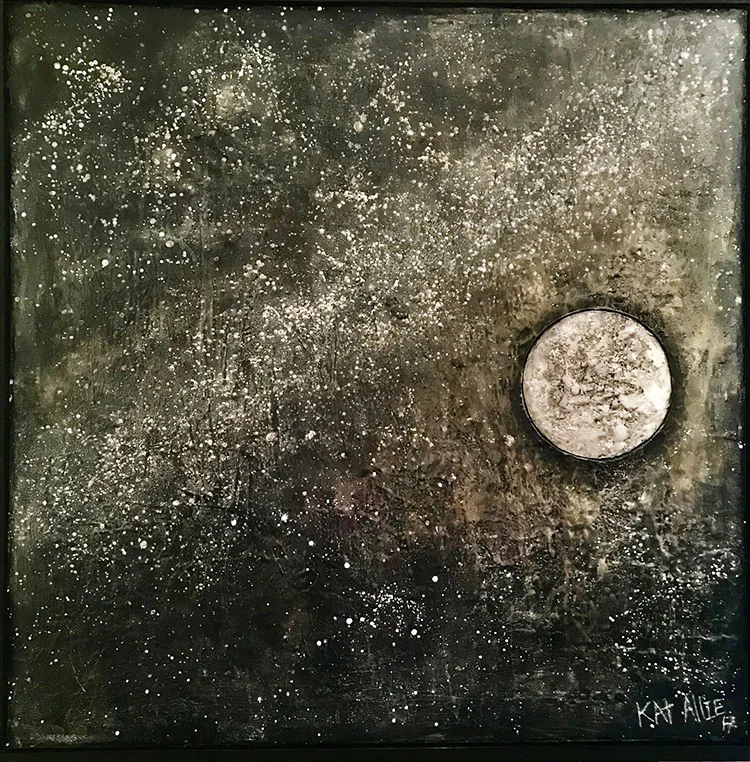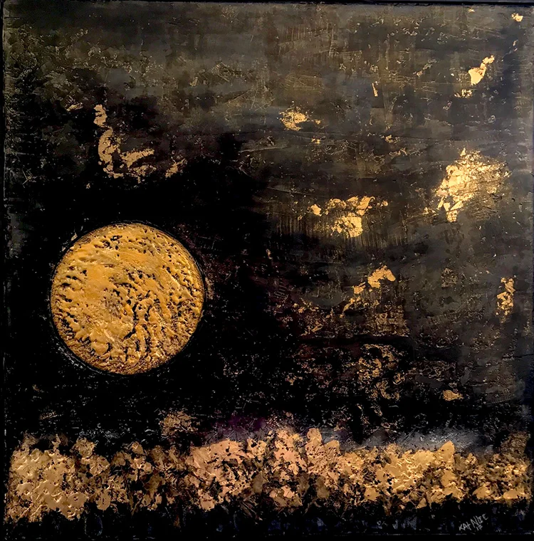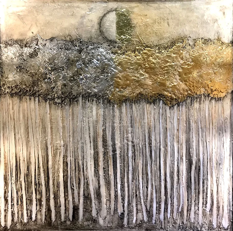 In this new series, "wax & wane", I challenged myself by limiting color and creating shapes, lines, and textures only using black, white, gold, and silver. The subject matter is found within the 8 phases of the moon as well as the symbolic and emotional relationship between humans and the Moon's lunar effects. Cycles of waxing and waning flow through our lives creating moments of action and energy yet they are balanced by times of rest and reflection. My process of encaustic painting also becomes an organic cycle of layering beeswax and then scraping away at the surface to reveal translucent surfaces. Creating harmony between all of the elements is where balance and beauty exist.